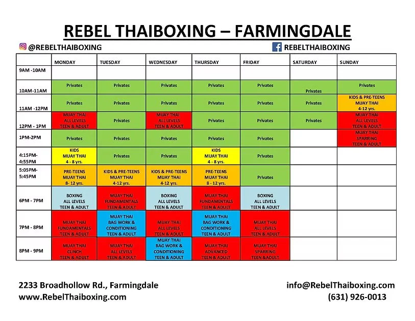 Rebel Thai Boxing offers the most competitive pricing on Long Island (in Nassau and Suffolk county), along with packed schedules offering classes 7 days a week for all ages and experience levels, with over 100 classes offered across all locations.